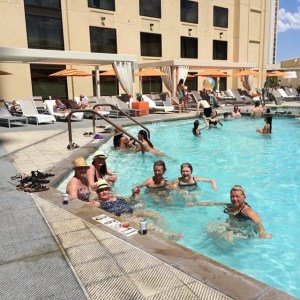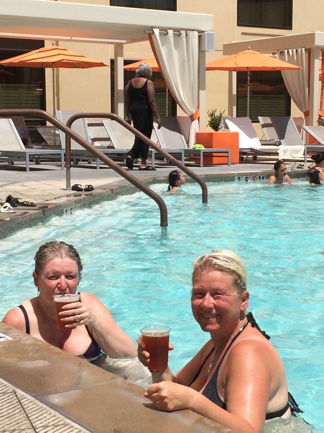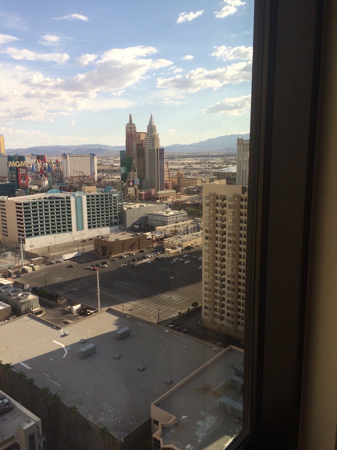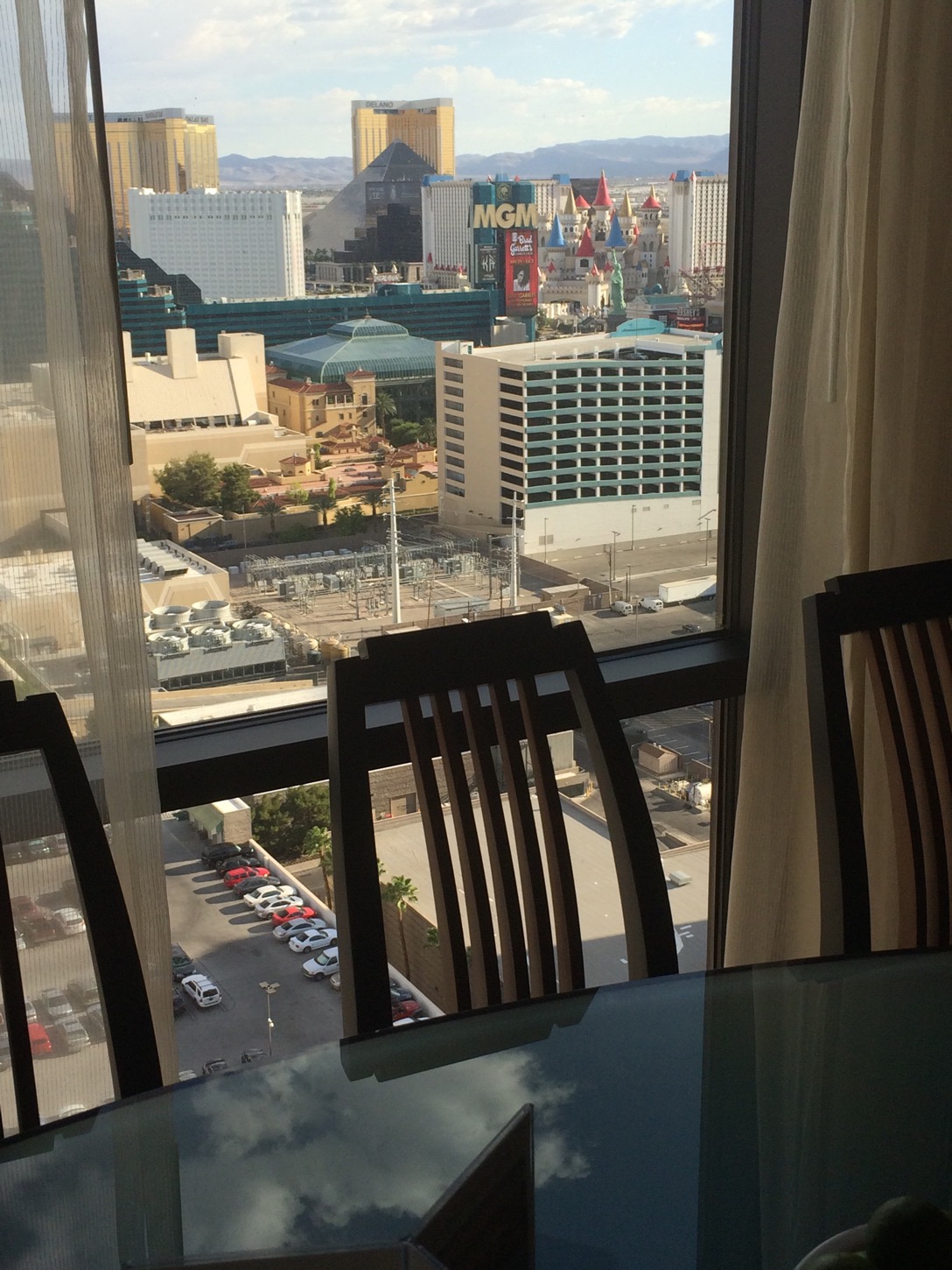 Essa tog över efter tankning o mat och körde väldigt säkert in oss på ”Strippen” och vårt hotel Marriott’s Grand Château. Vår svit var inte klar så vi var tvungna o vänta vid poolen på 5:e våningen.