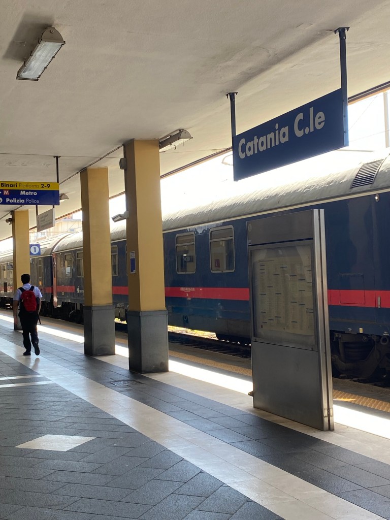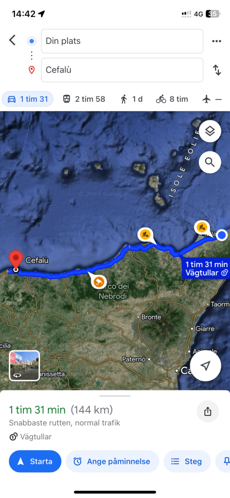 Tidig frukost, en Uber till Statione Catania och iväg mot Messina där vi bytte tåg mot Cefalu. Smidigt och skönt att slippa bil faktiskt. Du ser allt bättre från järnvägsspår, ibland kände vi igen vyer från Highway 1 i Californien.