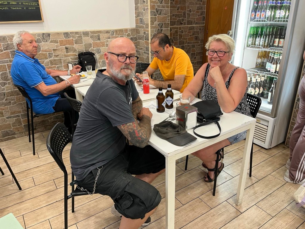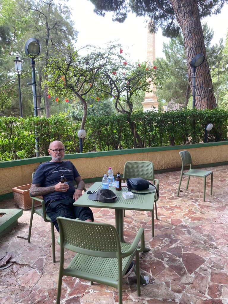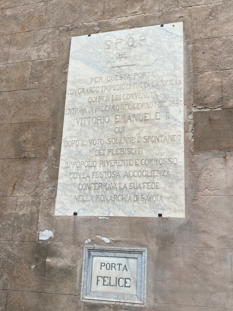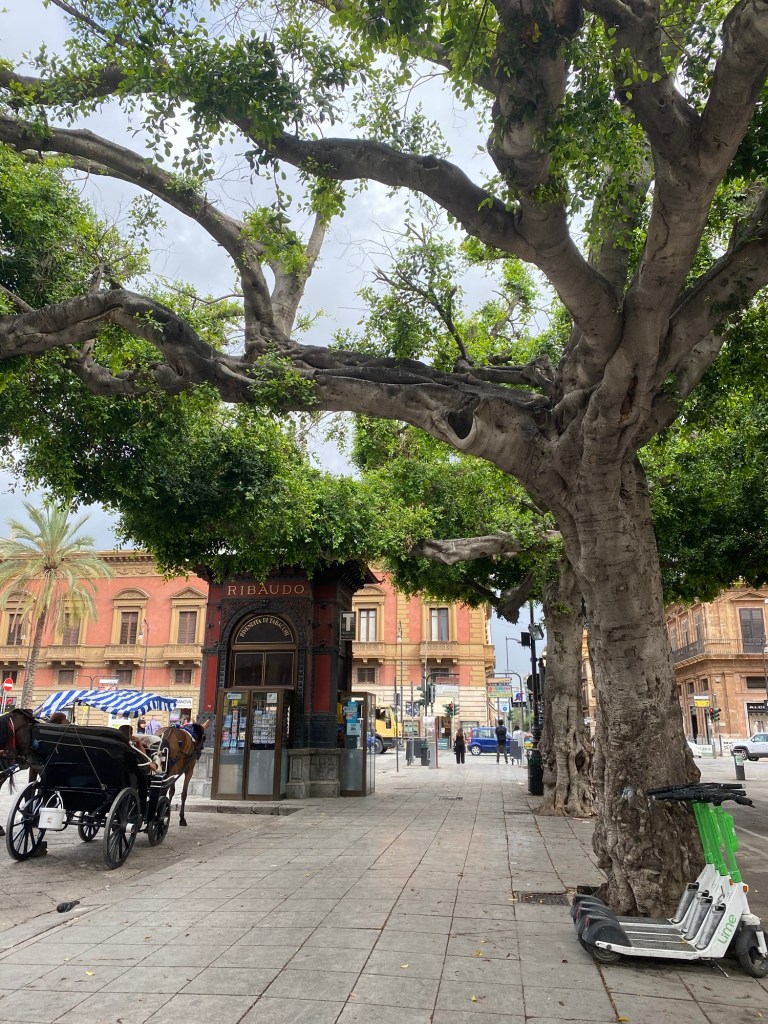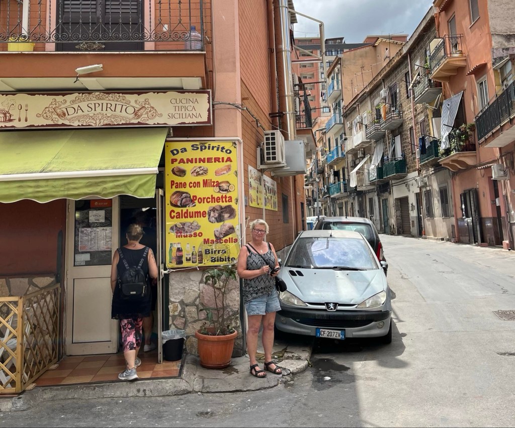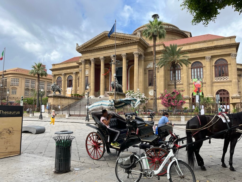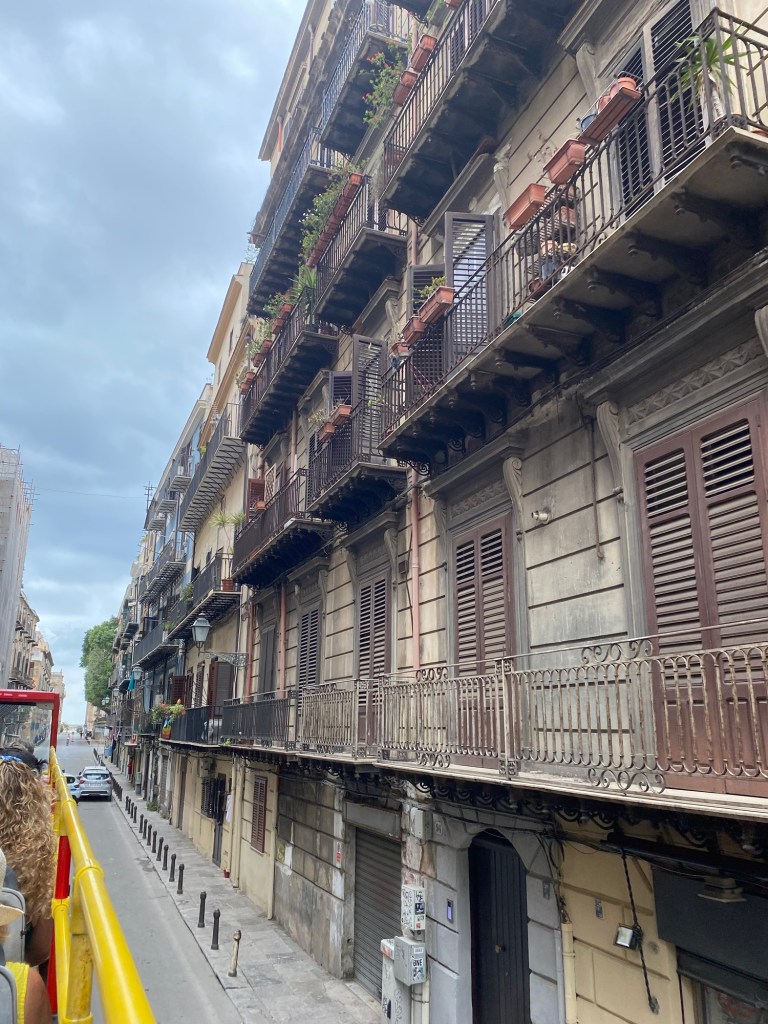 Dagen började med att öppna balkongdörren och släppa in öppnandet av Balloro marknaden. Där låg vi i sängen och viftade på tårna och lyssnade. Därefter spankulerade vi i gränder och på stora gator till hoponhopoff-bussen. Vi älskar italienarna mycket men idag fick en kvinna som försökte armbåga sig fram i kön till bussen känna på amerikansk demokrati. I samma ögonblick gör en flicka i 11-årsåldern detsamma med mig. Jag tar ett steg till vänster, framför henne, hon blev sur och knödde sig. Då fick hon känna på svensk demokrati 😆Basta! Kändes bra. Vi åkte iväg genom Palermo och upplevde alla kända byggnader, husfasader och olika stadsdelar. Skiljer sig mycket mellan de olika.