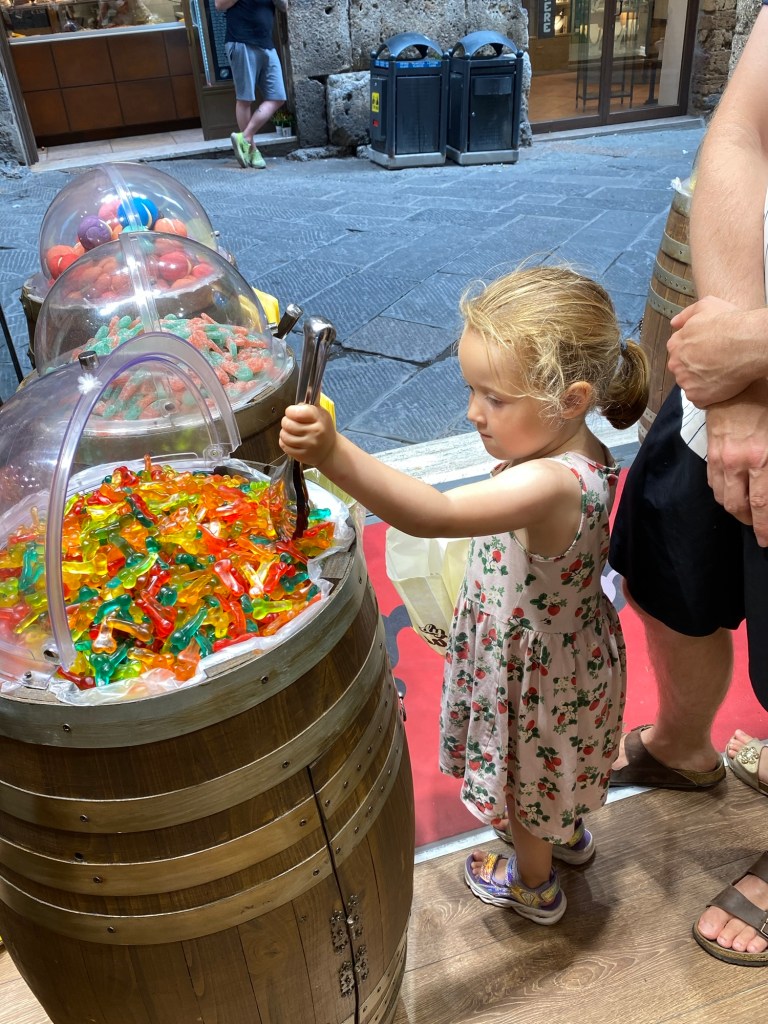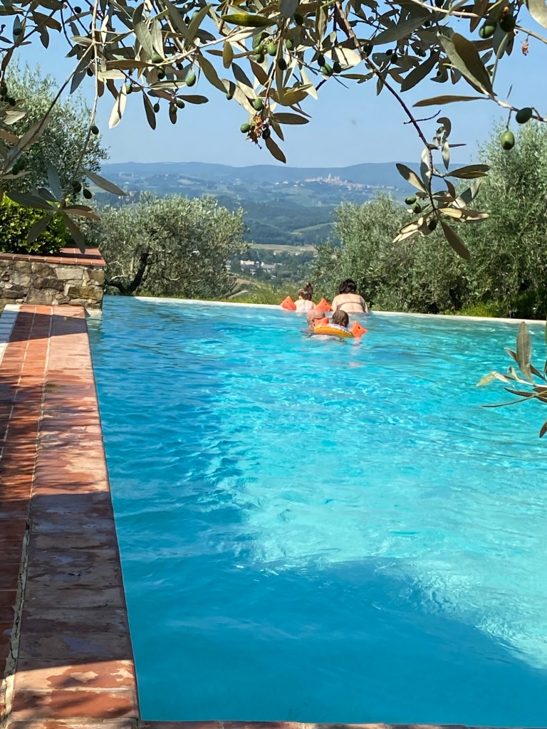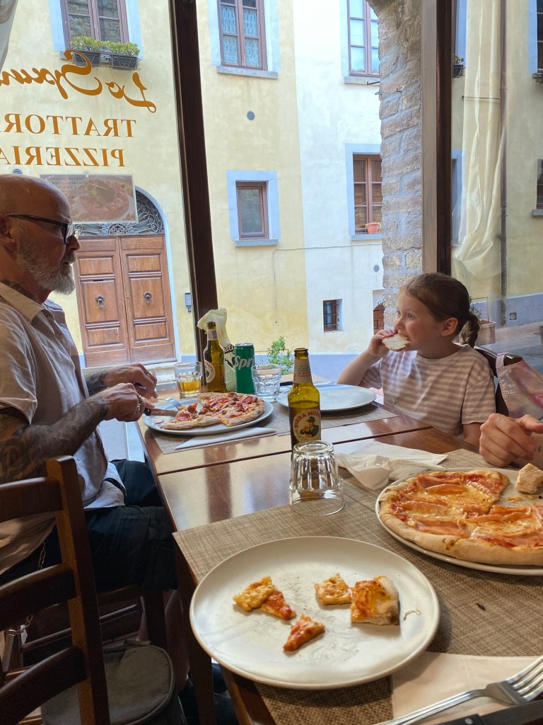 Vi käkade den första pizzan och godispåsarna fylldes😋 Vi åkte sedan tillbaka till borgen och tog ett kvällssdopp. Barnen knoppade in och vi satt ute ett tag i den Toscanska kvällen.