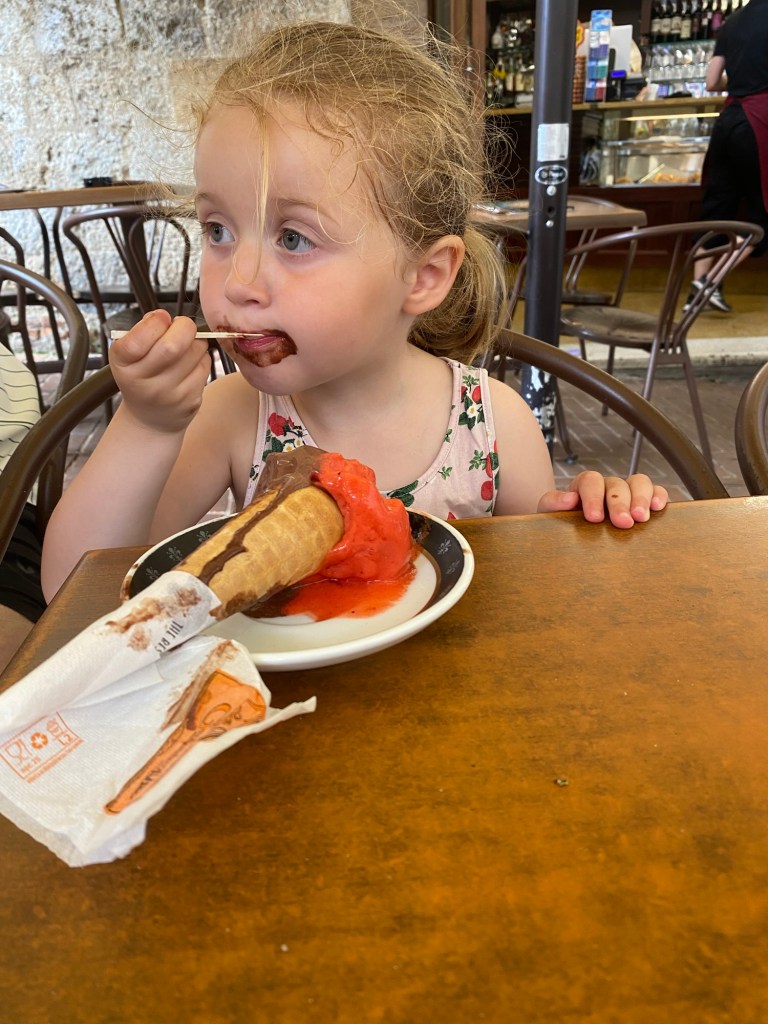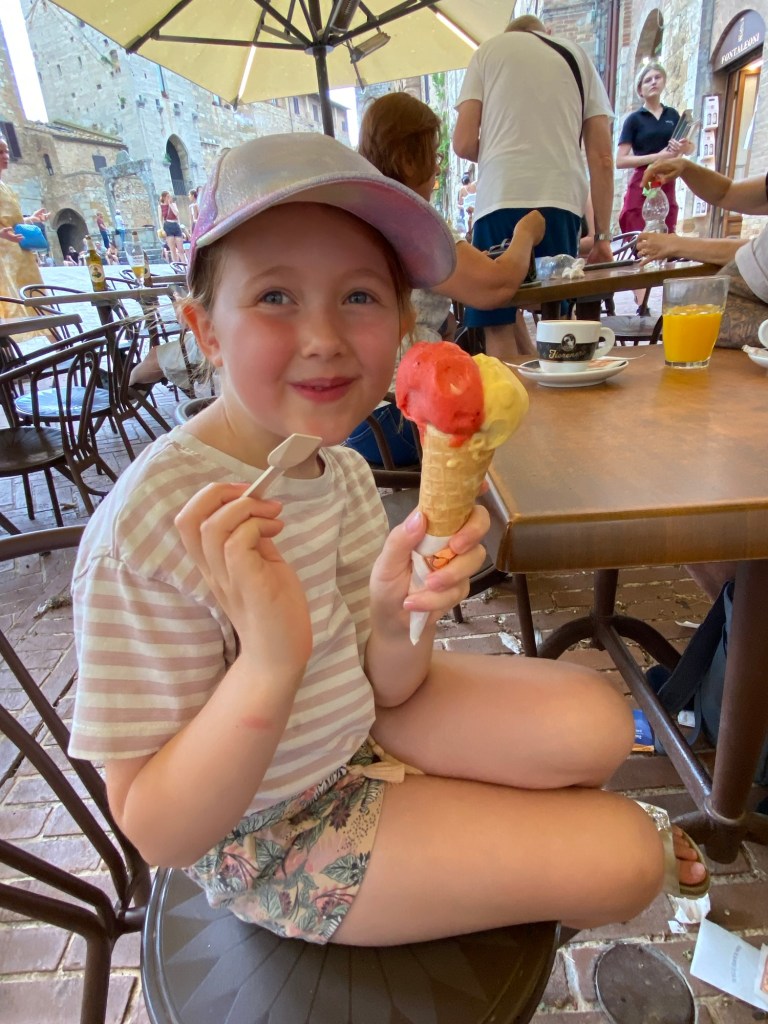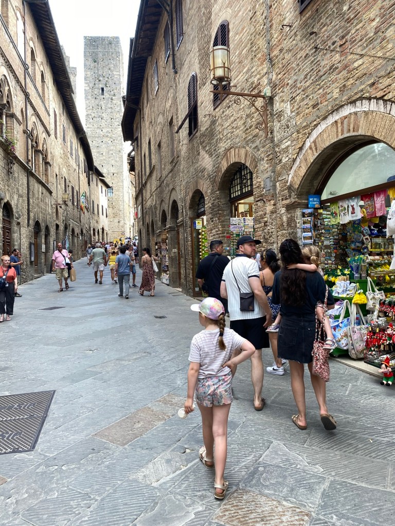Peter fixade lunch och sedan åkte vi till den medeltida staden San Gimignano. På nästan varje kulle i Toscana ligger dessa städer. Tempen sjönk lite då det kom ett härligt regn och en gelato under parasoll satt fint.