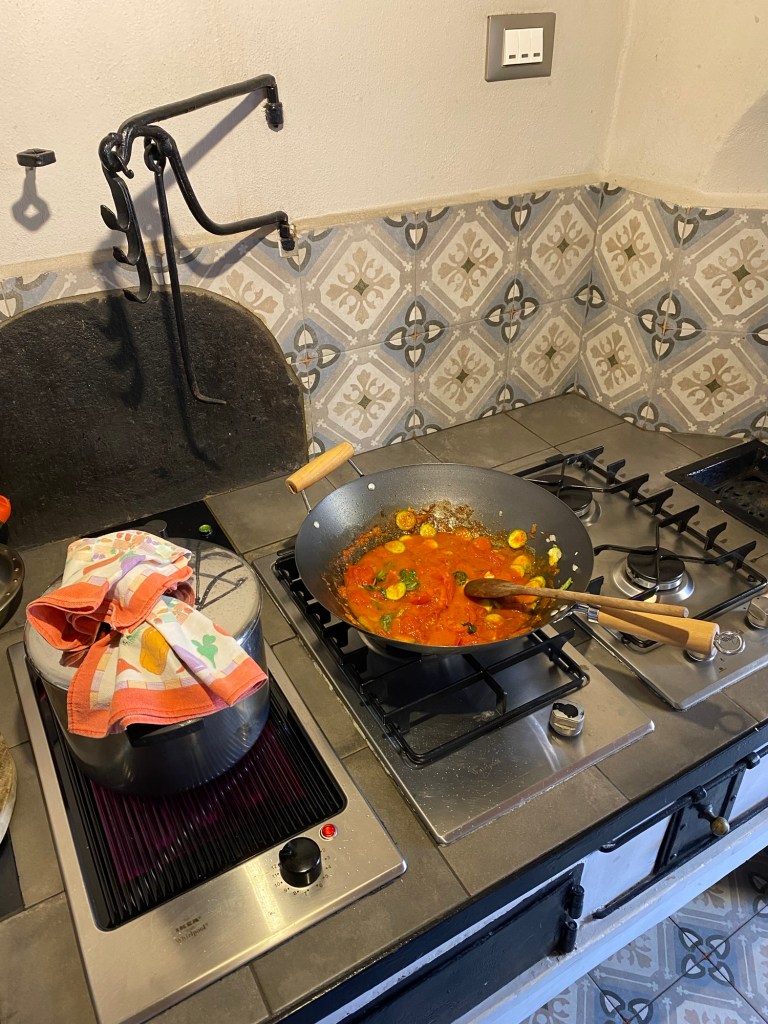 Oscar fixade mat i det gamla köket och vi åt ute på terrassen.