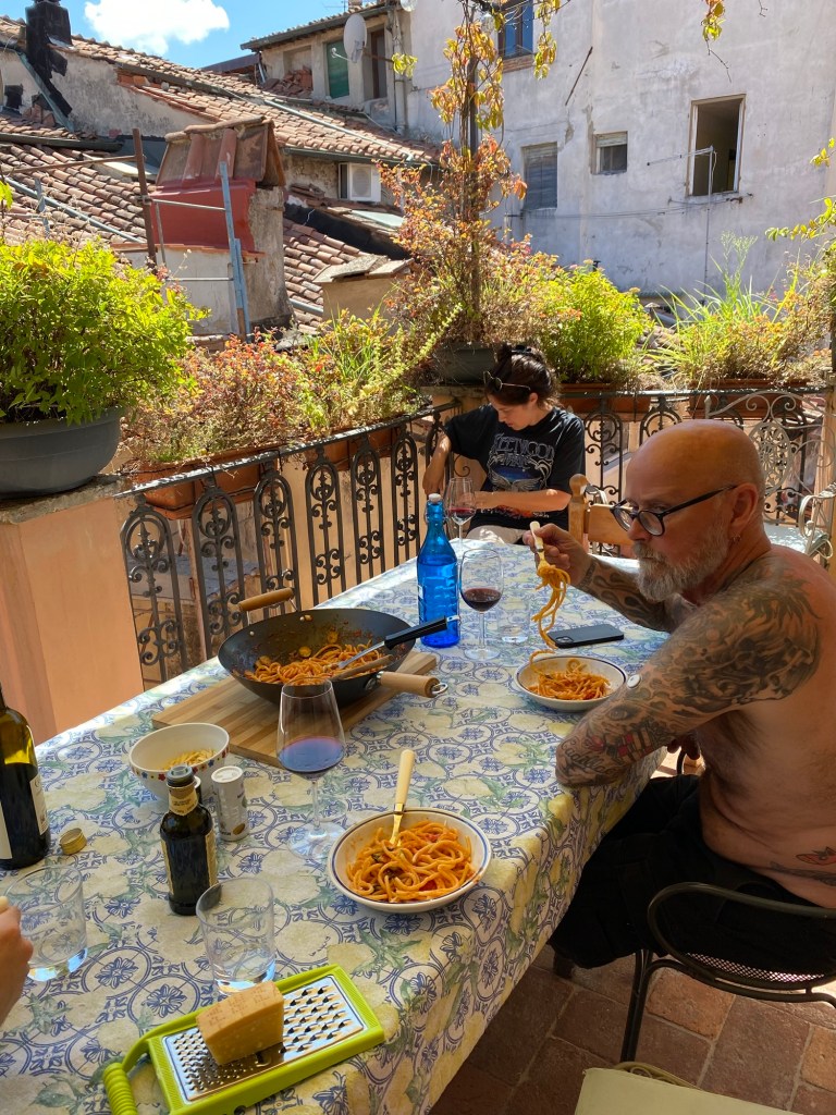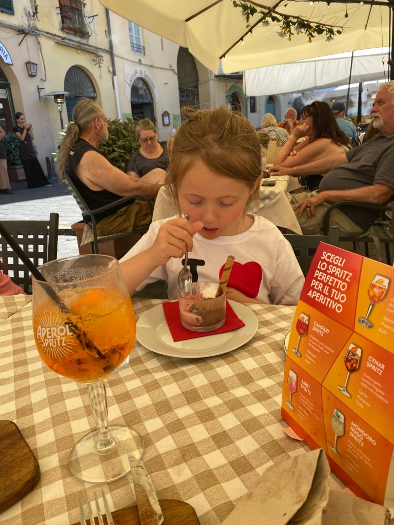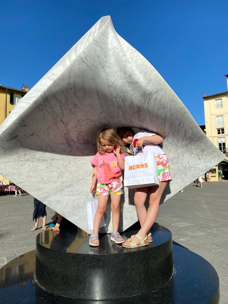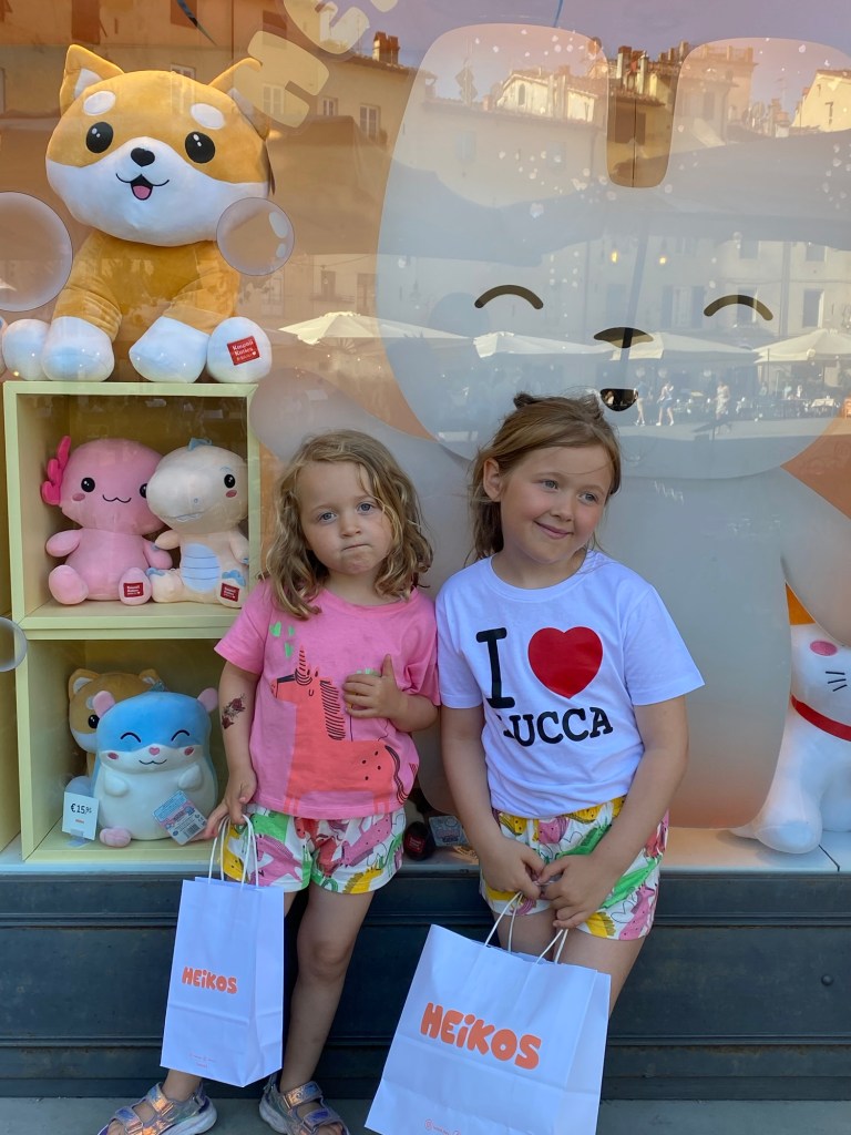 Tror att jag överträffat mig själv vad det gäller Airbnb denna gång. Jag o Peter var här för två år sedan och blev då betagna av denna stad. Vi tänkte att det vore härligt att få med barn och barnbarn dit. Nu blev det så och i höstas började jag leta boende där. Inte helt lätt men efter gediget letande hittade jag boendet som jag tänkte skulle passa, dvs innanför muren och med typ uteplats. Gissa om det blev spot on! Ofta när vi bokat via Airbnb har bilder och info om lägenheter inte riktigt varit så bra som vi trodde. Nu har vi hamnat i Puccinis gamla hem med hans piano. Söte värld. I historico centros lägenheter finns inga hissar. Ines räknade till 64 trappsteg upp, väskor och mat bars upp med en del andhämtningar 🥵