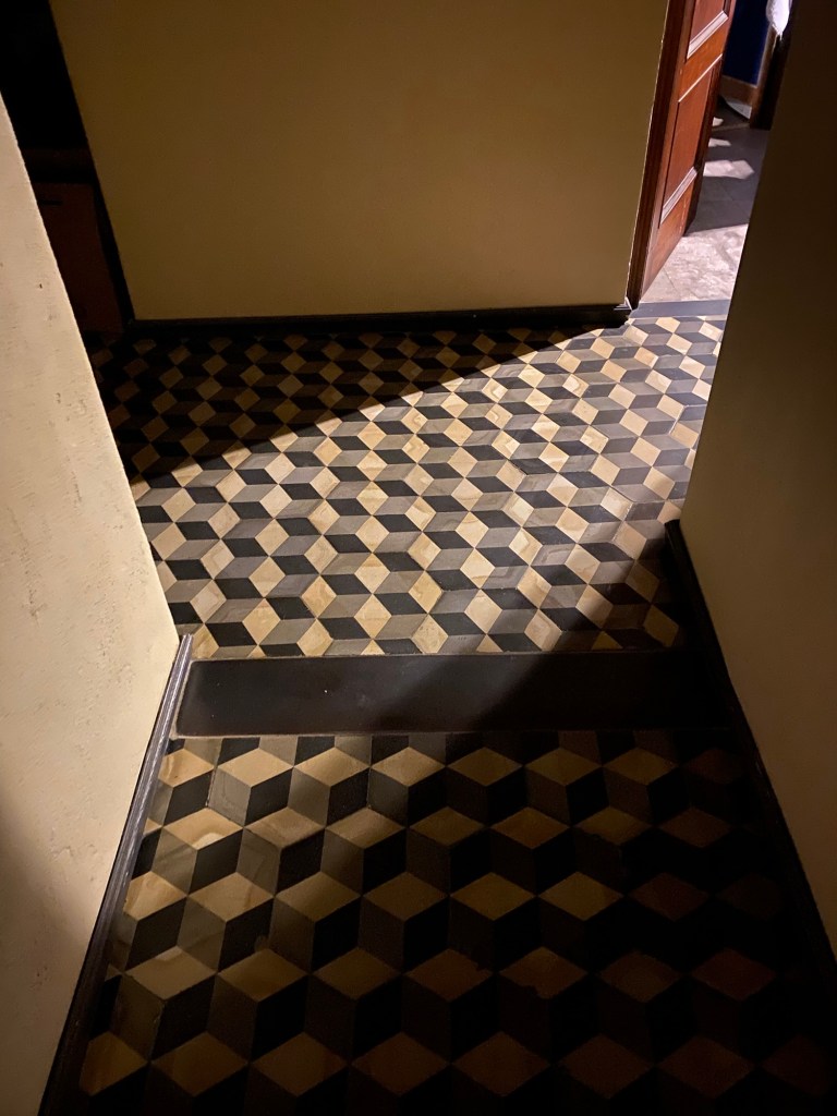 Nu sitter jag på vår terrass, lyssnar på grannarnas prat, alla installerar sig i rum och sängar efter en lång dag. Avslutar med bild på det fantastiska golvet, originalet, och funderar på om Puccini gick på det när han skrev Nessun Dorma ( Ingen må sova?