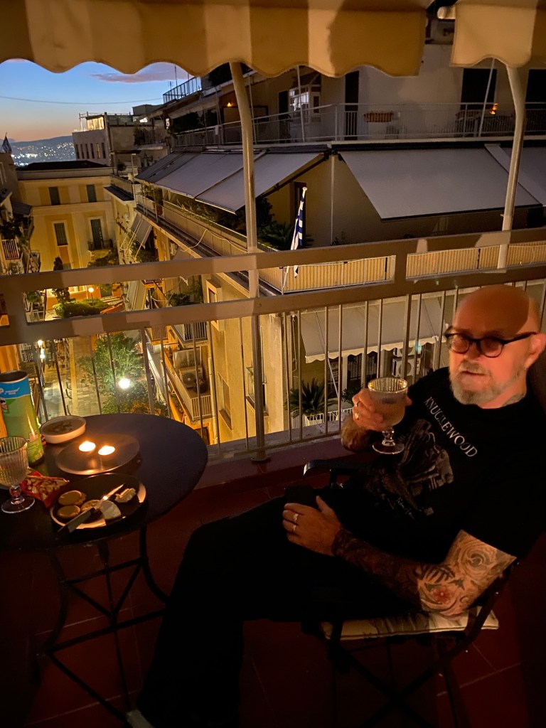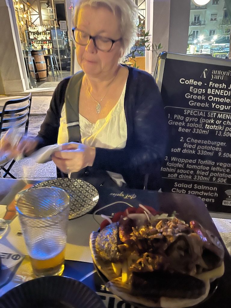 Denna gång åker vi med Aegan air, som alltid förstår och hör man inte vad som kommer ut i högtalarna ombord på flygplanet. ”Excuse me, what do you want to eat? We have ….. Vi hade inte fattat att det ingick mat utan tackar nej, och äter medhavd lingongrova med en tomatskiva som blött ner mackan. Nåväl, när vi landat tar vi en taxi från flygplatsen till boendet. Igen blev Airbnbbokningen kanoners. Bor mitt i Plaka. Efter en varm sittning på balkongen gav vi oss ut. Behövde inte gå långt, hittade ett ställe, Antonis Yard där vi åt en rätt delad på två med alla grekiska typ köttvariationer och fick grekiskt vitt vin och inhemsk öl. Ja, det var kanoners😛