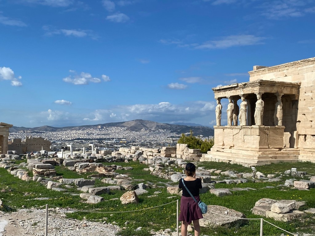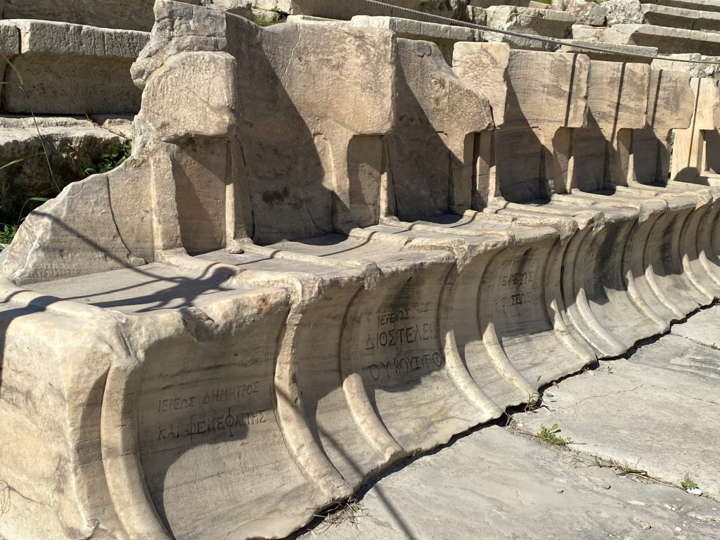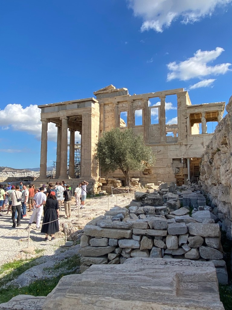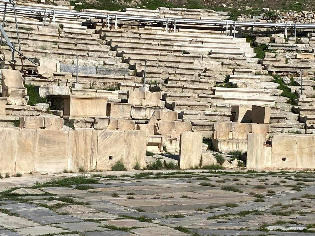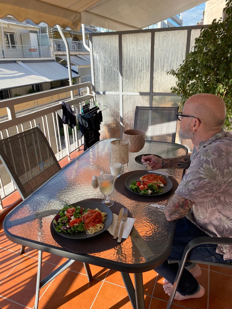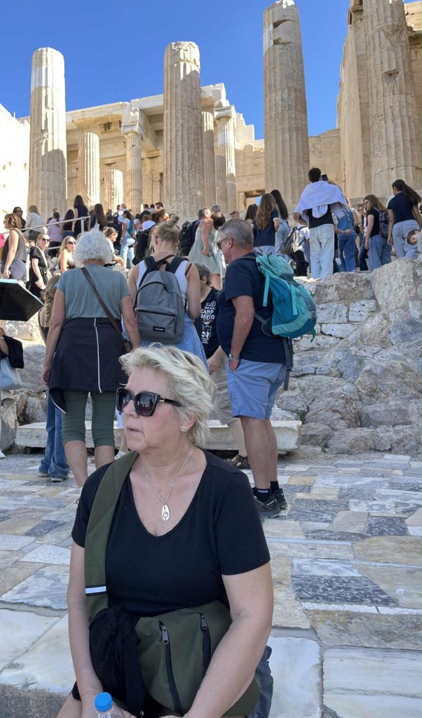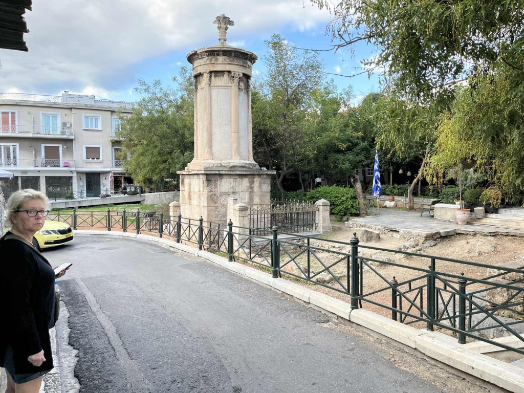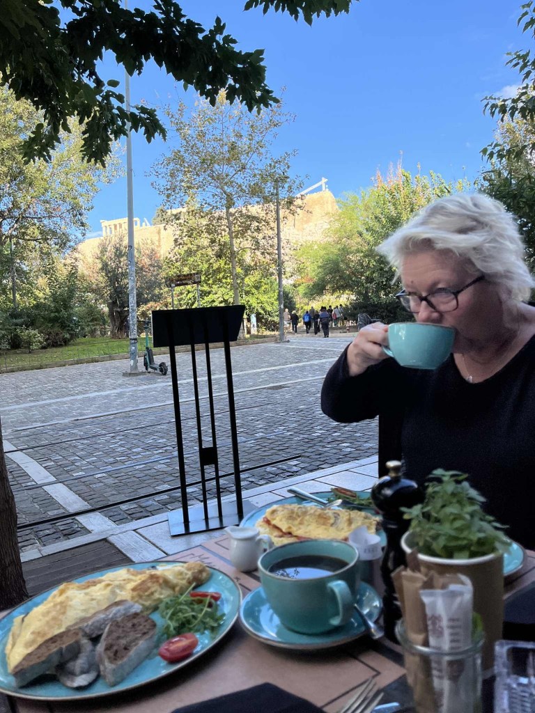 Vi bor ju väldigt bra i statsdelen Plaka. Nära till mycket! Idag Idag på morgonen gick vi i gränderna och på den bredaste gatan i Aten. Den anlades på grund av atenarnas väg till Dionysiousteatern där tragedier och komedier spelades upp. Vi gick förbi monument med Lysistrate (hon saknades dock) Lysitrate var kvinnan som fick andra kvinnor att sexstrejka för att få slut på alla krig. Komedin Lysitrate skrevs av Aristofanes. Vi käkade frukost nära inträdet till Akropolis. Lugnt och varmt 🏛️ Vi var ju tidigt ute, så efter en runda ner och kolla metron, inhandlades armband till barnbarn och kusinen till dem, Alice.