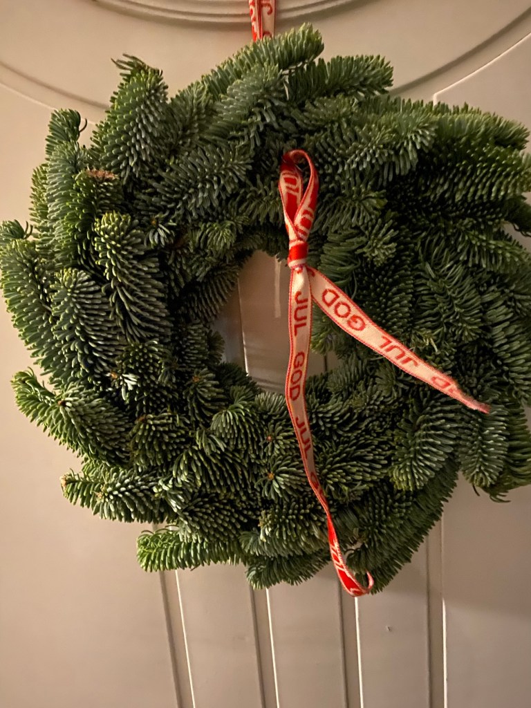 Jag Àr inte nöjd med pyntet pÄ kransen, men tÀnker att jag kanske ploppar in nÄt rött i den i morgon.